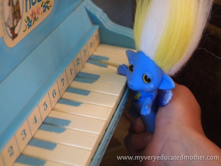 The funny thing about the Zelfs is that though they are marketed towards girls, both my sons have had fun collaberating with their sister to come up with zany hair-dos! Together they also had fun posing Lunanne around the house while they begged me to take pictures of her playing on the piano and sharing a snack.